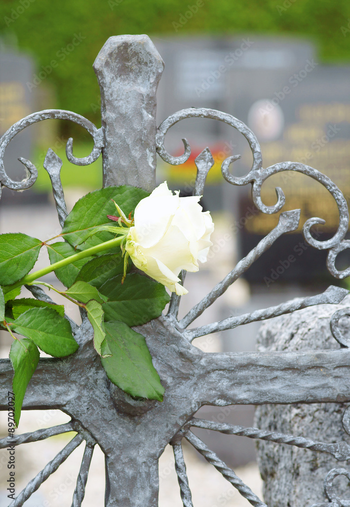 Allerheiligen Allerseelen Friedhof Grabkreuz Mit Weisser Rose Stock Photo Adobe Stock